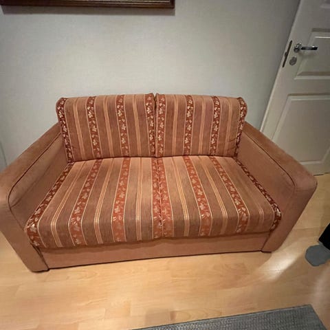 Annetaan vuodesohva, noin 155x80cm. Muuten ehjä, mutta kissa raapinut kangasta molemmista sivuista. Saa levitettyä vuodesohvaksi ja hyvin toimii levitettynä.