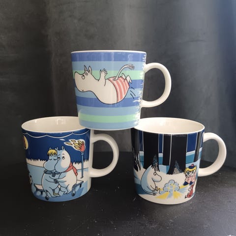 Muumimukit, toinen tarrallinen ja toinen tarraton, säilytys astia käyttämätön.