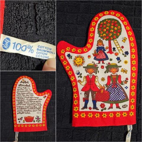 Hemtex patakinnas, jossa tumma pohjaväri ja omena-aiheinen kuosi vihreine lehtineen. Kintaassa on tikattu, lämpöä eristävä vuori ja ripustuslenkki. Sopii käytettäväksi kuumien kattiloiden, uunipeltien ja muiden keittiöastioiden käsittelyyn.