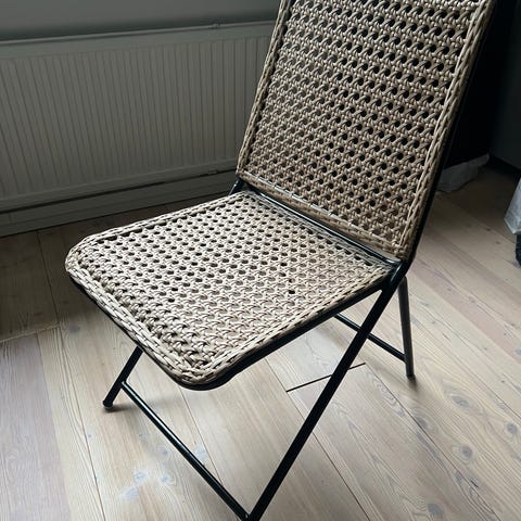 Metallinen rottinkituoli käsinojilla. Istuinosassa ja selkänojassa on punottu rottinkipinta, runko on metallia. Tuoli sopii esimerkiksi parvekkeelle, terassille tai sisäkäyttöön lisäistuimeksi. Selkänoja on hieman taaksepäin kallistuva ja käsinojat kaartuvat eteen, mikä tukee istuma-asentoa. Väri on luonnonrottinki ja harmaa metalli.