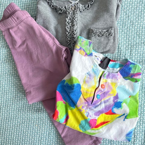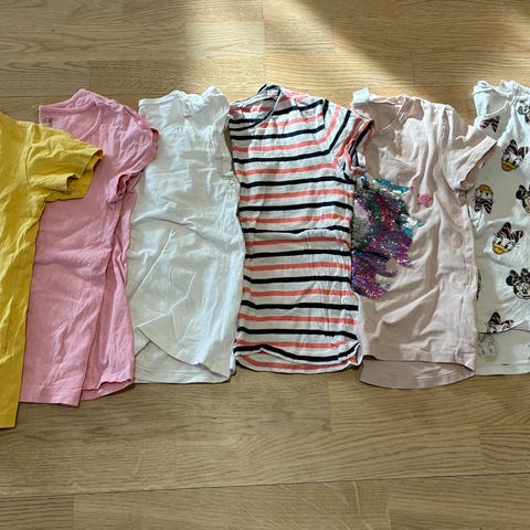 Next tyttöjen t-paidat, koko 122. Neljän t-paidan setti, jossa erilaisia kirjavia värejä ja painatuksia. Sopivat arki- ja vapaa-ajan käyttöön tytöille, joiden vaatekoko on 122 cm.