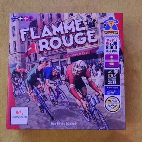 Flamme Rouge lautapeli 2–4 pelaajalle, suositusikä 8+. Pelissä ohjataan kahta pyöräilijää (rouleur ja sprinteur) korttimekaniikan avulla kohti maalisuoraa. Peli sisältää modulaarisen pelilaudan, pyöräilijänappulat, kortit ja tarvittavat merkit. Peliaika on noin 30–45 minuuttia. Peli soveltuu perhe- ja harrastepelaamiseen, jossa aiheena on maantiepyöräilyn etappikilpailu.
