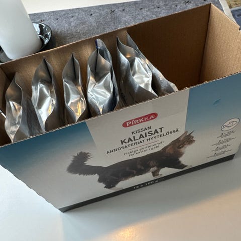 Meidän kissoille ei kelpaa, 10 pussia jäljellä. Nouto yliseltä. Päiväystä vuoteen 27.
