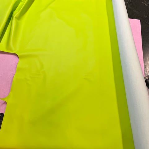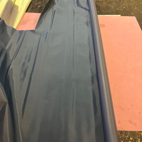 Sinivalkoinen kangas rullalla, beige toinen puoli. Pinta on kuvioitu ja joustava, soveltuu esimerkiksi verhoiluun, askarteluun tai muihin ompeluprojekteihin. Rullassa on useampi kerros kangasta. Leveys mitattu 149cm.