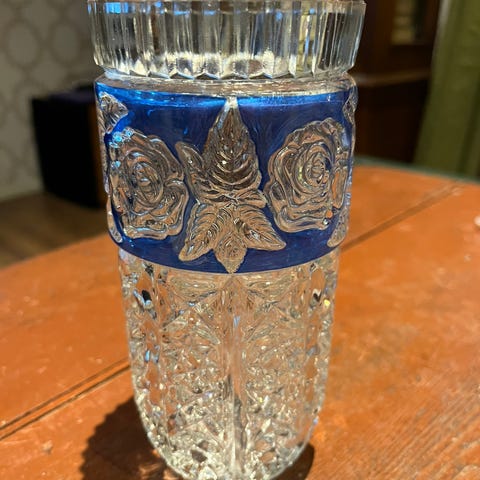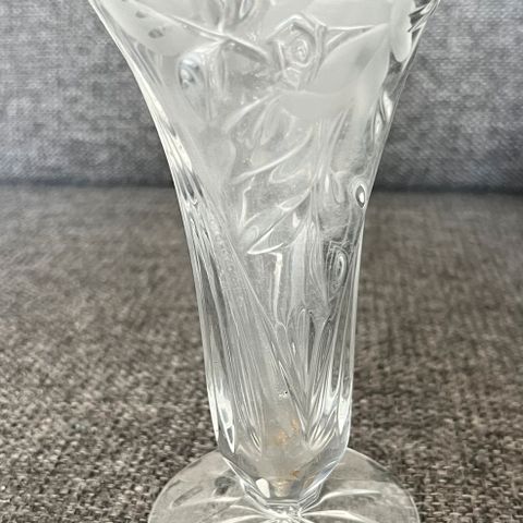 Kristallimaljakko, korkeus 25 cm, leveys 17 cm leveimmältä kohdalta. Kaunis ja painava.