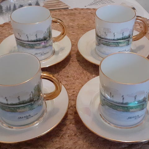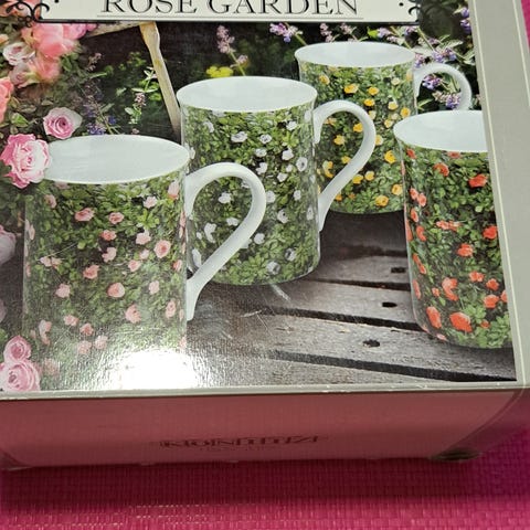 9 kpl ruusukuppeja ja 8 kpl aluslautasia. Kolme paria, joissa kuppi ja lautanen muodostavat parin. Neljässä kupissa pieni rokama. Kultaukset osittain kuluneita. Vintagea.