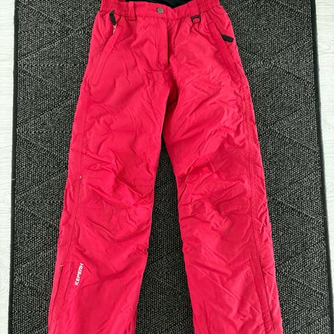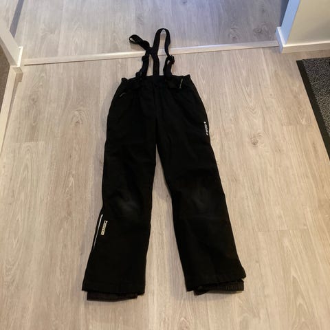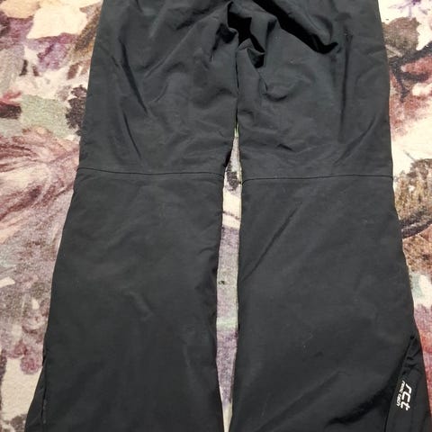 Toppahousut lumilukoilla. Kulumisjälkeä, mutta ei reikiä. Lahkeiden kuminauhat ehjät.