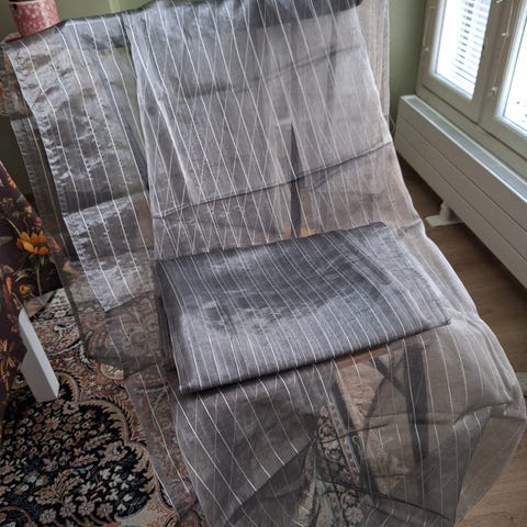 Luonnonvalkoinen läpikuultava verho. Lappu leikattu mutta muistaakseni puuvillaa. Yläreunassa lenkit ja erillinen kuja verhotangolle löytyy. Koko 140x245 cm. Pesun jäljiltä rypyssä, kestää silitystä.