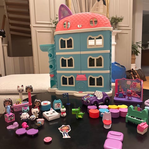 Gabbyn nukketalo ja muutama figuuri ja tavara. Hyvässä kunnossa. Katossa pieni mustejälki. Äänet toimii.