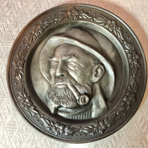 Keraaminen pieni matkamuistolautanen sis.telineen Japanin Nagasakista. Kohokuvioitu merimiestä muistuttava hahmo. Korkeus n.13 cm telineessä, leveys n.11,5. Katsothan myös muut ilmoitukseni.