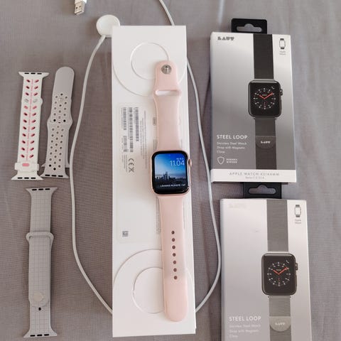 Apple watch series 5 40 mm aluminum + ceramic case. Hyvässä kunnossa, näytössä pieni naarmu. Akun kapasiteetti 81%. Pelittää oikein hyvin ja jaksaa päivän yli latauksella. Mukaan kaksi erikokoista vaaleanpunaista silikoniranneketta ja yksi kultainen metallinen ranneke sekä alkuperäinen laatikko ja laturi.