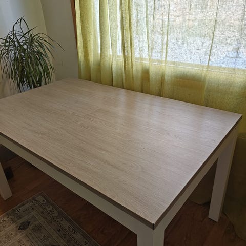 Pöydässä on käytönjälkiä, mutta se on täysin toimiva ja tukeva