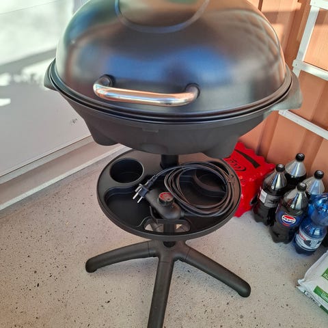 Sähkögrilli. Vapaasti seisova malli jalustalla ja kupukannella. Grillissä on pyöreä valurautainen paistopinta, jossa yhdistelmä sileää ja uritettua grillauspintaa. Lämpötilaa säädetään portaattomasti termostaatista. Soveltuu ruoan valmistukseen esimerkiksi parvekkeella tai pihalla, kun käytettävissä on sähköpistorasia. Väri musta.