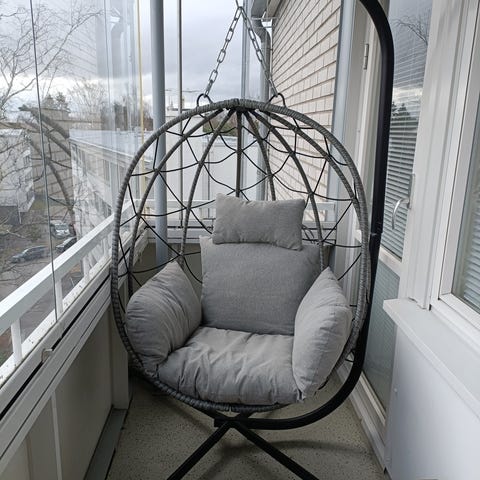 Riipputuoli parvekkeelle musta runko harmaat pehmusteet