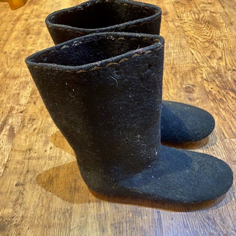 1970-luvulta Aarikan huopatossut. Ryhdikkäät ja kumipohjaiset. Ei juurikaan käytetty. Pohjien liimaamisesta joitain pieniä tahroja pohjan reunoissa (5 markan suutari teki 10 markan vahingon 😐). Muuten lämpimät ja ihan salonkikelpoiset, nätit vaikka hameen tai pillifarkkujen kanssa käytettäviksi.