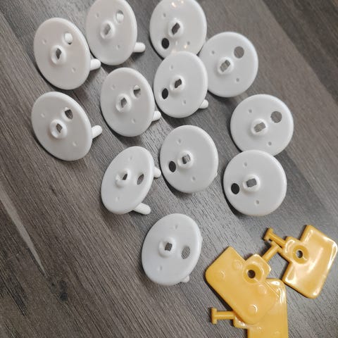 Kahta erilaista pistorasian suojaa, suojatulppa estää lasta laittamasta sormia tai esineitä pistorasiaan. Pienemmät enemmän käytettyjä/kuluneempia, mutta kaikki kyllä asiansa hoitaa kuten pitää.