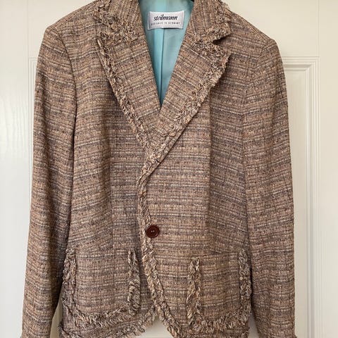 Jakussa on monivärinen, pystyraidoitettu kuosi tummissa ja vaaleissa sävyissä. Edessä on kauluskäänteet ja nappikiinnitys, kolme nappia. Pitkät hihat ja hieman vartaloa myötäilevä malli. Sopii esimerkiksi arki- tai juhlapukeutumiseen.