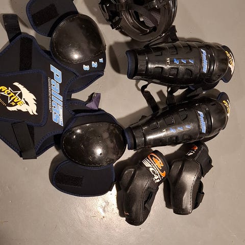 Bauer ja CCM jääkiekkovarustesetti 5-7 vuotiaalle (yth M). Settiin kuuluvat hartiasuojat, kyynärsuojat, polvisuojat, hanskat, housut, harjoituspaita sekä kaulasuoja, alasuojashortsit ja kypärä (XS).