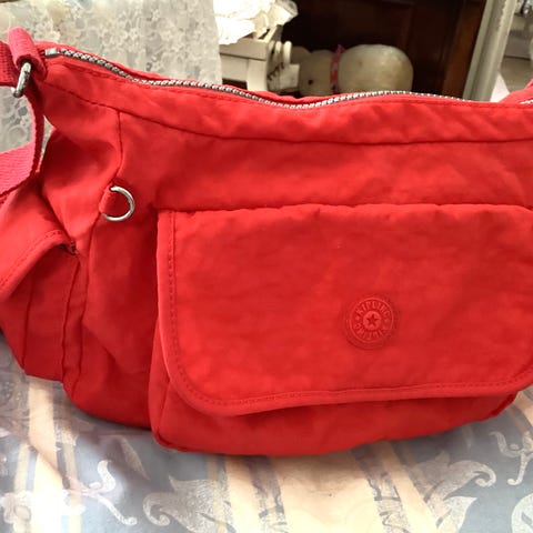 Kipling olkalaukku naisille. Materiaalina kangas ja värinä punainen (kuvan punainen hieman liian kirkas). Laukussa on säädettävä olkahihna. Ulkopuolella on vetoketjutasku edessä ja takana sekä pieni riippuva koriste. Sisäpuolella on vetoketjullinen tasku ja avotaskuja pienten tavaroiden säilytykseen. Soveltuu arkilaukuksi ja pienten henkilökohtaisten tavaroiden kuljettamiseen.