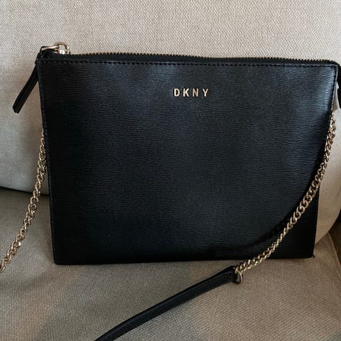 DKNY naisten olkalaukku, mielestäni materiaali on oikea musta nahka. Laukussa on tikattu pehmeä pinta, läppämalli. Olkahihnassa on ketjua, ja voi käyttää kätetävati kaksinkerroin olalla käsilaukkuna tai pidempänä olkalaukku-hihnana.