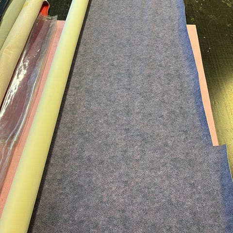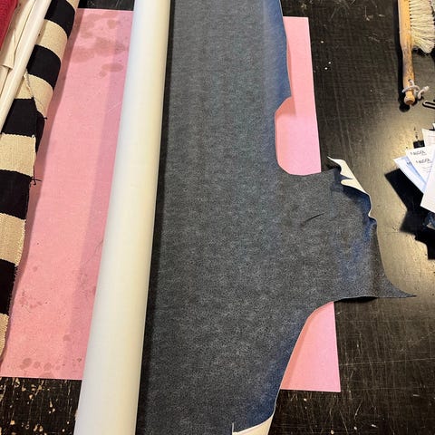 Harmaa kangasrulla, leveys 150cm ja toisessa päässä pitkä kaistale 22cm. Materiaali ohutta kiiltäväpintaista taipuisaa. Soveltuu esimerkiksi askarteluun, verhoiluun tai muihin ompelu- ja sisustusprojekteihin.