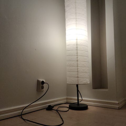 Lattiavalaisin toimii ja on muuten siistissä kunnossa, mutta lattiavalaisimen pohjassa ollut betonipaino on hajonnut, joten valaisimeen pitää tehdä remonttia, että siitä saa toimivan ja että se pysyy suorassa pystyssä.