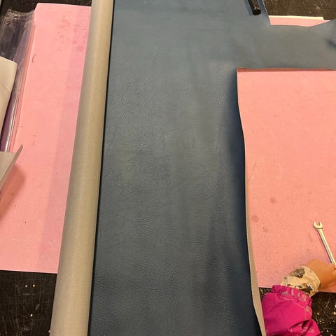 Sininen keinonahka / tekonahka kangas. Pituus on noin 144cm ja leveys noin 54 cm. Soveltuu esimerkiksi verhoiluun, askarteluun tai muuhun sisustus- ja käsityökäyttöön.