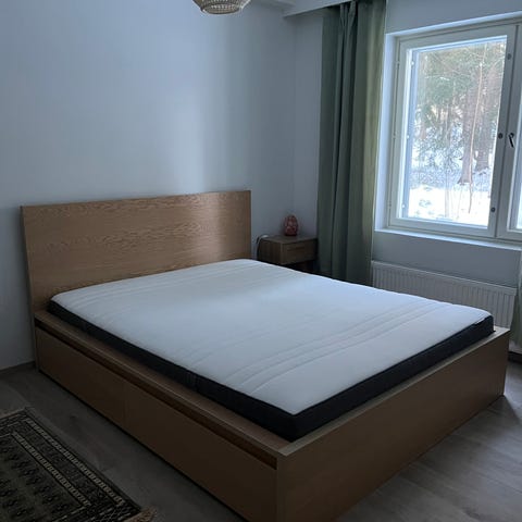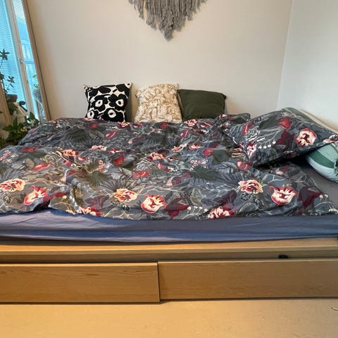 IKEAn MALM-sänky kahdella säilytyslaatikolla. Sängyssä on korkea pääty ja rungon alla vetolaatikot vuodevaatteiden tai muun tavaran säilytykseen. Väri on musta, ja sänky sopii kahdelle nukkujalle. Patja ei kuulu kauppaan.