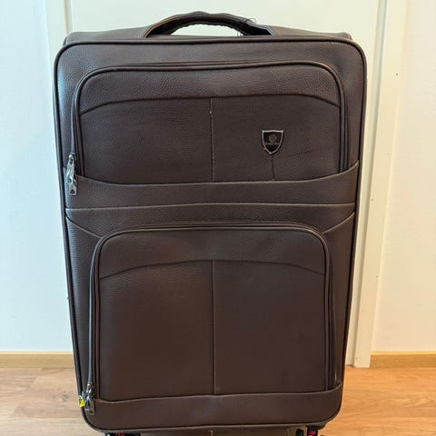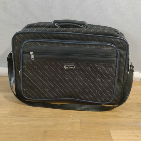 Red Tag-merkkinen siisti tummansininen kankainen käsimatkatavaralaukku kahdella pyörällä ja vetokahvalla. Mitat: Korkeus 53cm, leveya 35cm, syvyys 20cm.