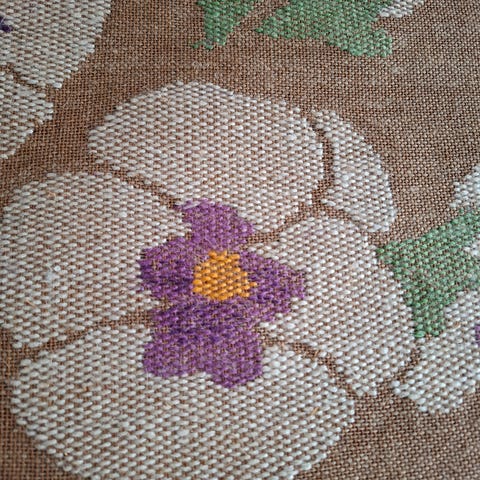 Kangaspuissa aidoista pellavalangoista kudottu uniikki kuultokudosteos päivänkakkarat.