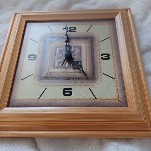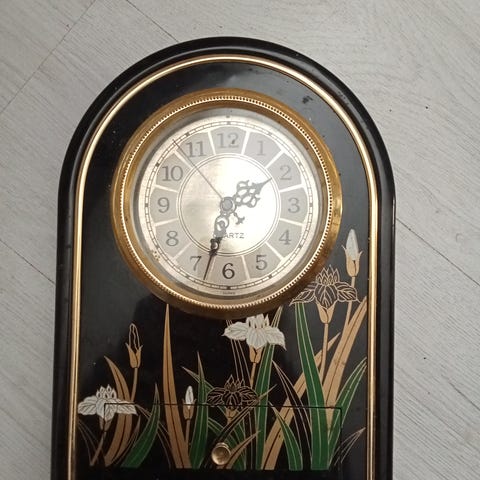 Seinäkello. Tikittää ja heiluri lyö, vetoavain mukana. Viisarit liikkuu, mutta jätättää aika paljon. Vähän kulumaa puussa, mutta yleisilme siisti.