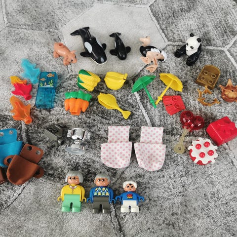 Isoja Duploja pari laatikkoa. Eläimiä (poislukien toisen kuvan panda), aitoja, alustoja, ukkeleita yms. Lisäksi ainakin numerojuna. Vähän leikitty.
