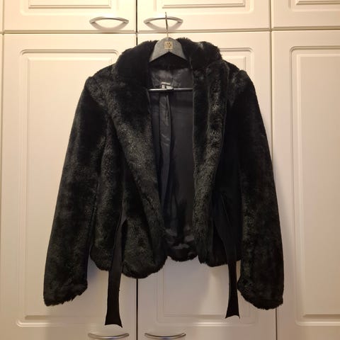 Tekoturkki, koko M (mielestäni pientä kokoa), väri vaalea roosa-valkoinen.