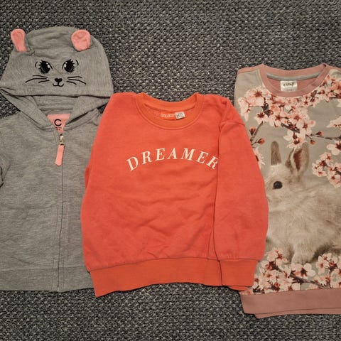 3kpl paitoja koko noin 104-110. Hihaton, t-paita ja pitkähihainen paita. Hyvin saman kokoiset.