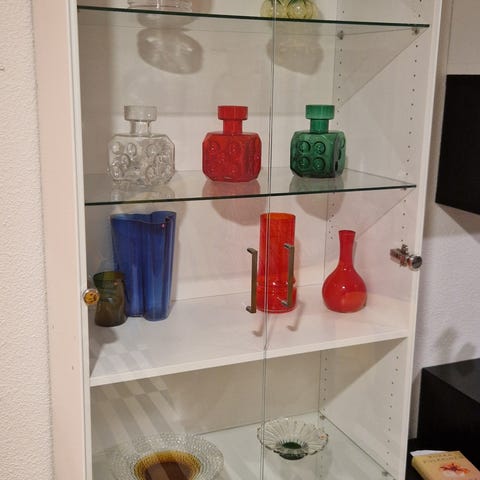 Täysin hyväkuntoinen lasivitriin, jossa alaosassa liukuovelliset hyllystöt. Yläosassa peili lasihyllyjen takana.
