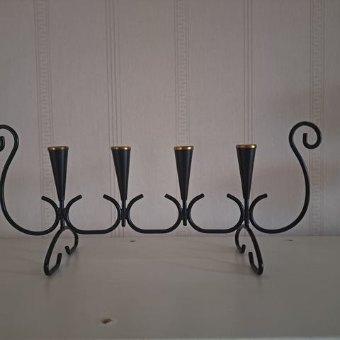 Gunnar Anderin funkkistyylin kynttelikkö. Kaikki tassut tallella. Kuvassa kynttilöinä kuusenkynttilät.