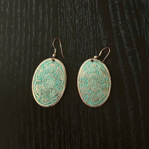 Kauniit korvakorut, ostettu Glitteristä tms aikoinaan, eli eivät ole vanhat vaikka muotokieli sopii menneille vuosikymmenille.