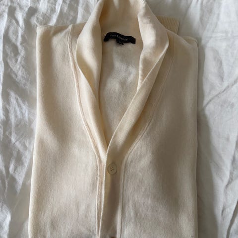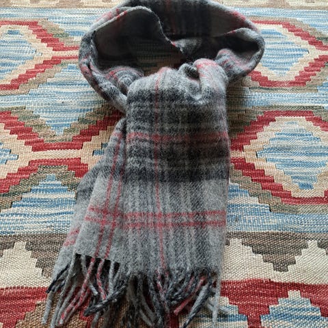 Myydään Fine Merinos villakaulahuivi. Väri on harmaa ja siinä on chalk stripe-kuvio.