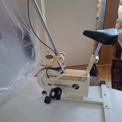 Annetaan kuntopyörä. Laitteen digitaalunäyttö ei toimi. Vastus-säätö toimii normaalisti + ja - säätimestä. Polkimissa on hihnat jalkojen tukemista varten. Istuin on mukava ja korkeus on säädettävä.