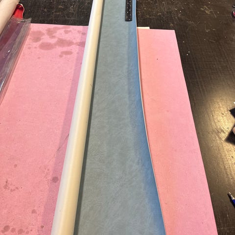 Tummansininen keinonahka/ tekonahkakangas rullalla. Leveys noin 145 cm. Toinen puoli on sininen, nahkajäljitelmää muistuttava pinta ja toinen puoli vaaleampi, kangaspintainen tausta. Soveltuu esimerkiksi verhoiluun, askarteluun ja muihin ompelu- ja sisustusprojekteihin, joissa tarvitaan kestävää tekonahkamateriaalia. Saa tarjota.