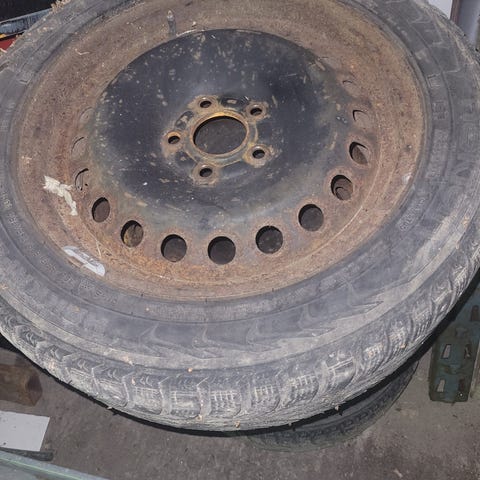 Volvo V70 MK2 alla olleet vanteet nypityillä nastarenkailla myynnissä. Yksi rengas tyhjenee.