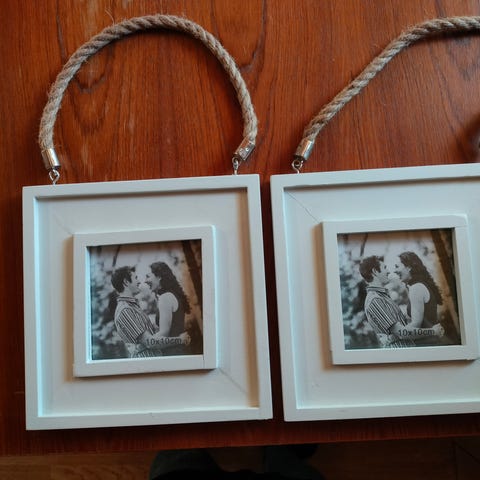 Koristeellinen valokuvakehyssetti. Setissä on kaksi erikokoista puista kehystä, joissa on kaiverrettu ja koristeellinen reunus. Kehykset ovat pöydälle asetettavia ja niissä on taustatuet. Iso kehys 23x18cm, kuvan koko 14x9cm.