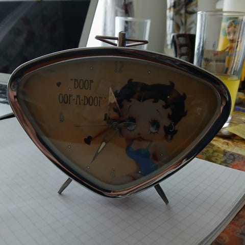 Kuvan vuonna 1995 Japanista ostettu Citizen Hassuru Boo herätyskello possuaiheisella hahmolla. Sanoo japaniksi herätys (ohaioo) kun alkaa herättää. Samantyylinen kuin Niiskuneiti herätyskello. Alkuperäinen hintalappu jenimääräisenä.