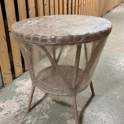 Pieni siisti rottinkipöytä. Yhdestä jalasta nyöri irti, voi liimata paikalleen.