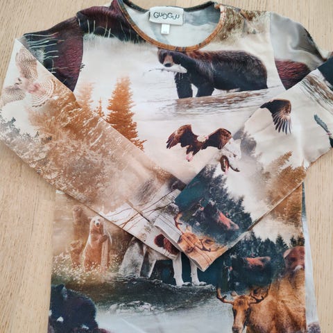 Gugguun collegepaita koossa 122. Ehjä mutta käytetty ja edessä on haalea rasvatahra jota en ole koettanut poistaa.