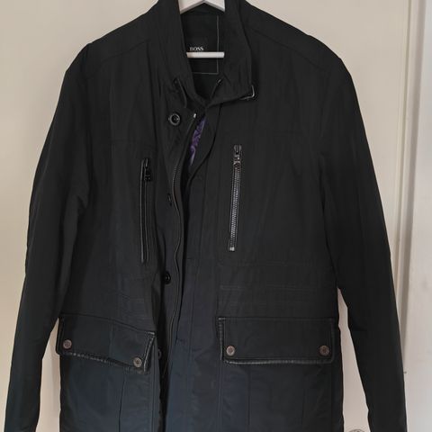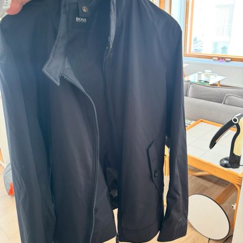 Hugo Boss miesten takki, koko 56. Väri tummansininen. Materiaalina polyamidi. Edessä vetoketjukiinnitys ja vetoketjulliset taskut. Hihansuissa ja helmassa resorit. Sopii arki- ja kaupunkikäyttöön viileämpiin säihin. Povitaskut napilliset.