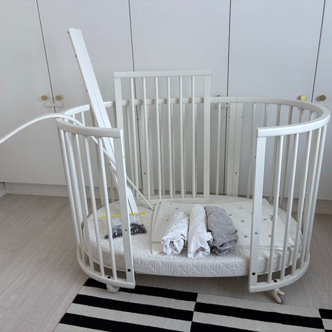 Myydään valkoinen Stokke Sleepi sänky pakettina, johon kuuluu myös vastasyntyneen Mini-sänky. Kauppaan sänkyjen lisäksi kuuluu:
