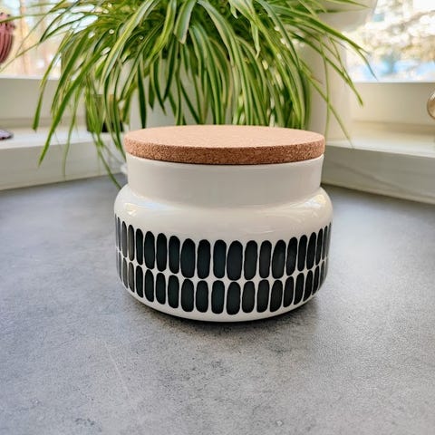 Myynnissä Marimekon kannellinen Oiva Alku-purkki 0,7l hintaan 25e. Purkki on ehjä, kiiltävä ja muuten täysin uutta vastaava, mutta kannen sisäpuolella pieni tummempi kohta näkyvissä (ks. neljäs kuva). MMM, koiratalous. Katsothan muutkin ilmoitukseni :)