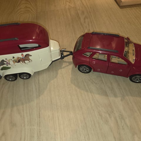 Schleich leluautosetti, johon kuuluu lava-auto ja hevoskuljetusvaunu, ihmisiä ja hevonen. Tuulilasi irti, mutta ehjä ja saa kiinnitettyä.