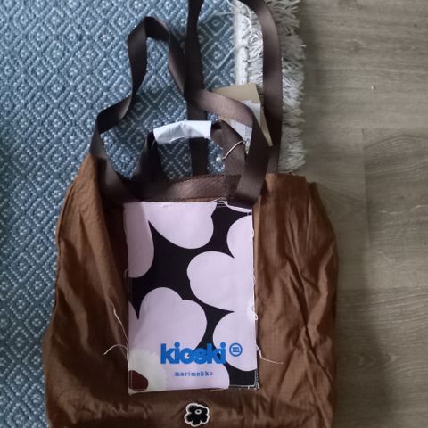 Marimekko Kioski funny tote. Kaksi kantokahvaa ja kaksi pitkää olkahihnaa. Materiaali ohutta ja kevyttä polyamidia. Koko 38x41 cm.